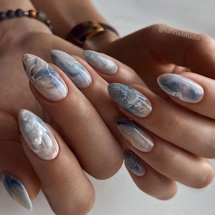 As unhas de gel marmorizadas parecem verdadeiras obras de arte. Com traços fluidos que lembram pedras naturais, esse tipo de decoração deixa qualquer mão poderosa.
